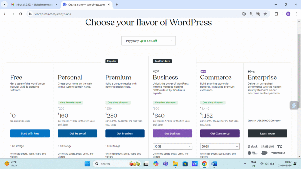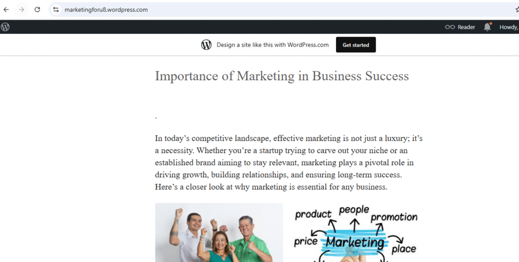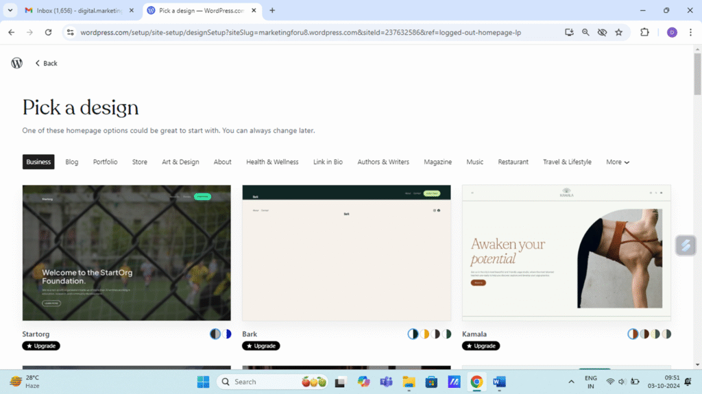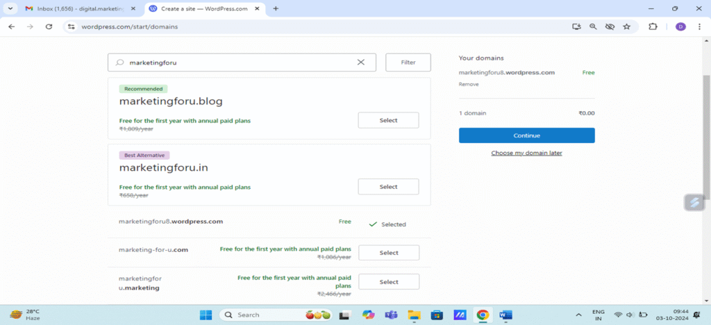 Enter the domain name. Click free version and then click continue. Free version of website will be of this form – www.marketingforu8.wordpress.com. Free site will come with .wordpress.com at the end.