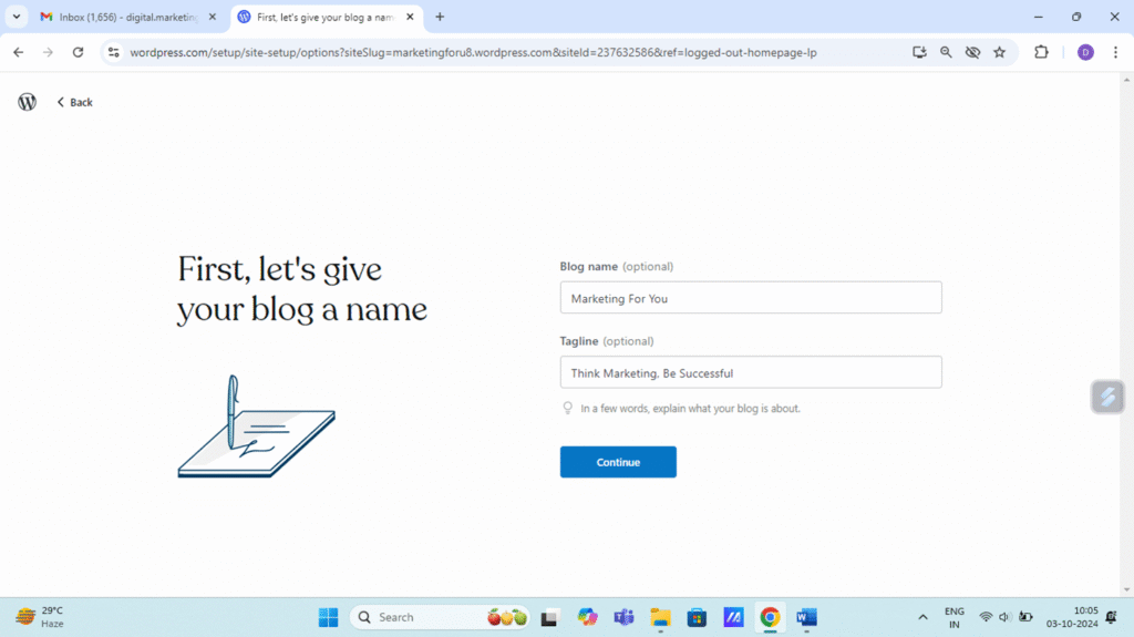 Step 5. Give your website/blog name and tagline and Continue